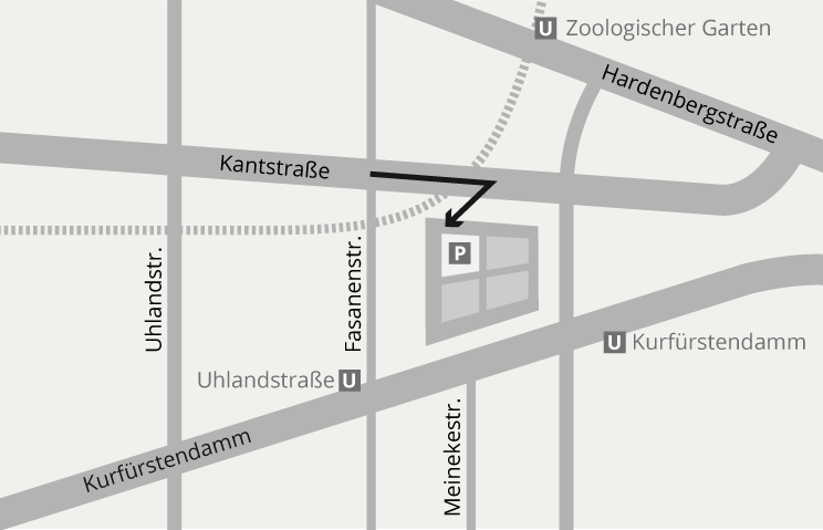 Mit dem Auto gelangen Sie über die Kantstraße in unsere Tiefgerage – die Einfahrt befindet sich direkt nach der Unterführung der Bahn auf der rechten Seite. Oder nutzen Sie die Tiefgarage des Motel One auf der gegenüberliegenden Straßenseite.